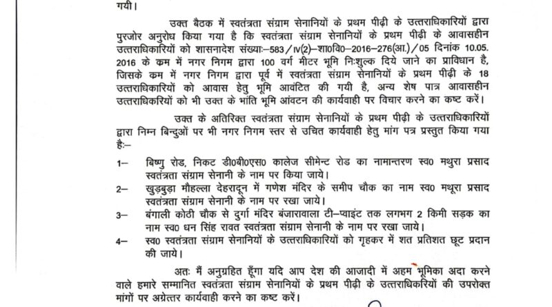 स्वतंत्रता संग्राम सेनानियों के परिजनों ने डीएम से मांग की सरकार द्वारा जारी शासनादेश जिसमें नगर निगम अन्तर्गत स्वतंत्रता सेनानियों के परिजनों को 100 वर्ग मीटर भूमि आंवटन के सम्बन्ध में है, जिसके अन्तर्गत लगभग 17 लाभार्थियों को भूमि आवंटित कर दी गई है शेष उत्तराधिकारियों को भू-खण्ड आवंटन का अनुरोध किया किया। जिस पर जिलाधिकारी ने तत्समय ही मेयर नगर निगम से दूरभाष पर स्वतंत्रता संग्राम सेनानियों के उत्तराधिकारियों को नगर निगम क्षेत्रान्तर्गत भूखण्ड आवंटित करने का व्यक्तिगत अनुरोध किया था। जिलाधिकारी ने नगर निगम को अनुरोध पत्र भी प्रेषित किया है।